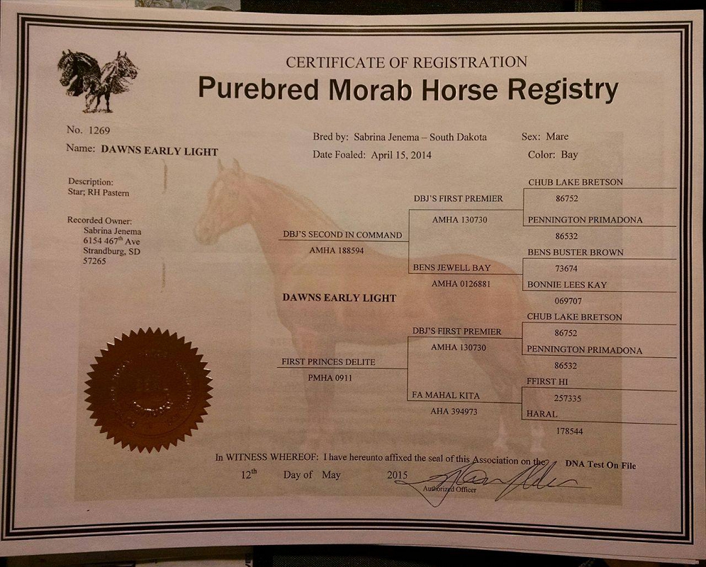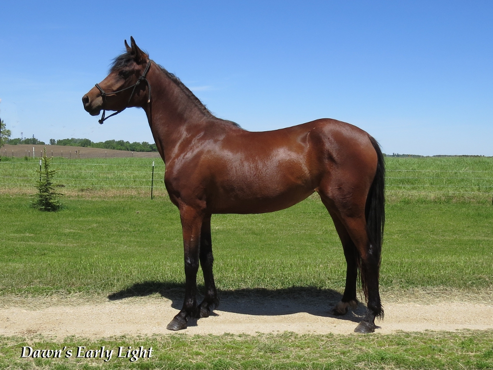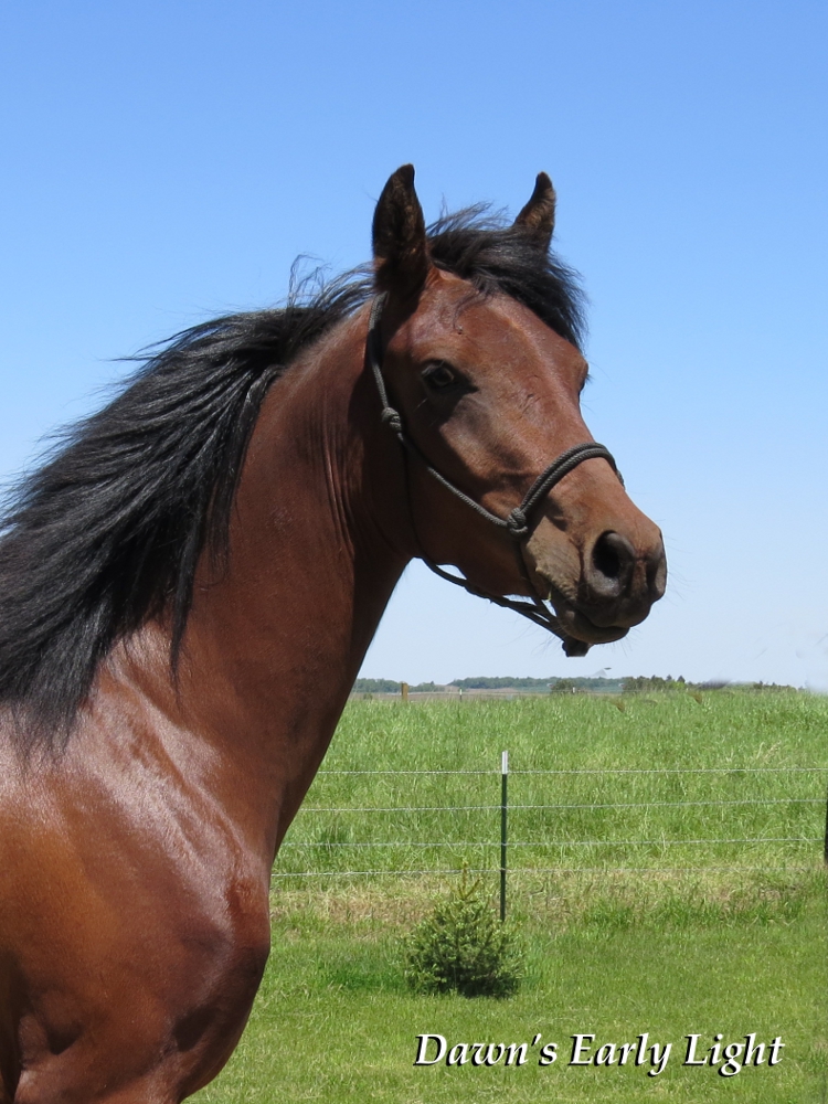 Dawn is a spunky filly out of a Morab mare that we used to own, and our young stallion, Casey, which makes her 3/4 Morgan and 1/4 Arabian. She has excellent conformation and motion and would make for either a great trail horse or competition horse. Either way we are excited about her and hope that she goes to the right home. But for now, we will enjoy the life that she brings to the Prairie Winds Farm.